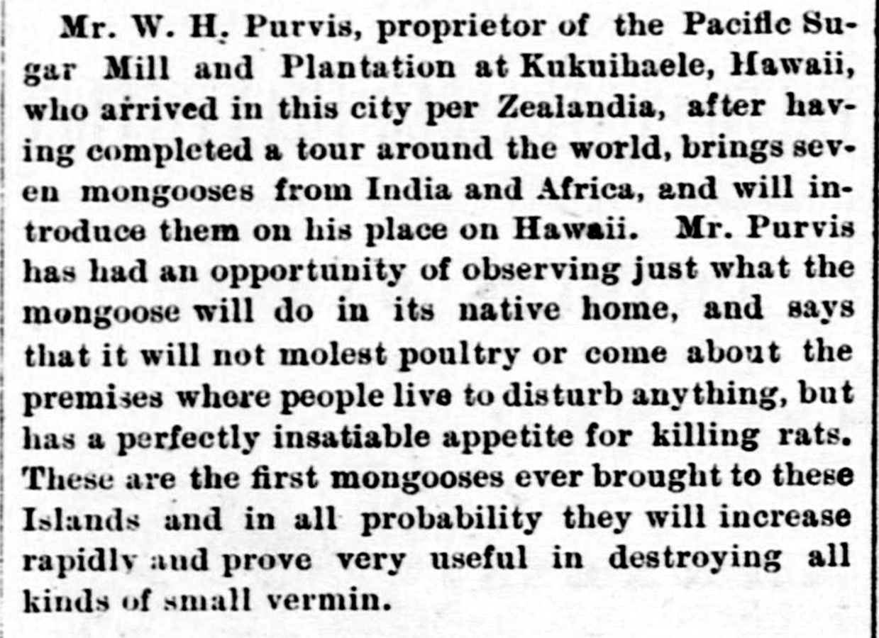 Mr. W. H. Purvis, proprietor of the Pacific Sugar Mill and Plantation at Kukuihaele, Hawaii, who arrived in this city per Zealandia, after having completed a tour around the world, brings seven mongooses from India and Africa, and will introduce them on his place on Hawaii. Mr. Purvis has had an opportunity of observing just what the mongoose will do in its native home, and says that it will not molest poultry or come about the premises where people live to disturb anything, but has a perfectly insatiable appetite for killing rats. These are the first mongooses ever brought to these Islands and in all probability they will increase rapidly and prove very useful in destroying all kinds of small vermin.