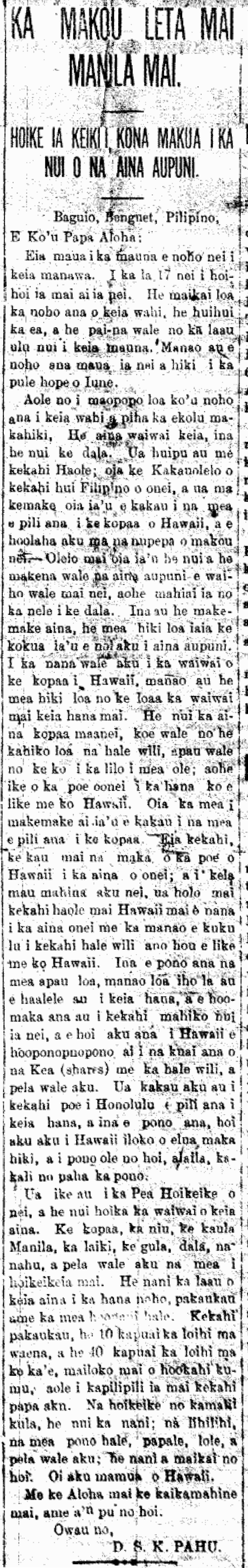 It is not certain whether I will stay here for a full three years. This is a fertile land if you have a lot of money. I met up with a haole man who is the secretary of a Filipino organization here, and he wants me to write about sugar in Hawaii and to publish it in the local papers. He tells me that there are vast and much government lands that are left unfarmed because of lack of funding. If I want land, he can definitely help me to ask for government land. Looking at the worth of sugar in Hawaii, I believe that money can be made through this endeavor. there are a lot of sugar lands here, however, the sugar mills are decrepit and sugar has been pushed to the side; the people here do not understand the sugar industry as they do in Hawaii. That is what makes me want to write about sugar. Here’s something else: Hawaii’s people have their eyes set on here, and a couple of weeks ago, a haole man came from Hawaii to look at the land here with the intent of building a modern sugar mill like in Hawaii. If everything goes well, I am determined to leave this job and to start a large sugar plantation here, and I’ll return to Hawaii to work out the selling of shares [kea] and the purchase of a mill and so forth; I have written to some people in Honolulu about this venture, and if things go well, I will come home to Hawaii in two years, but if they do not go well, I suppose I will wait it out.