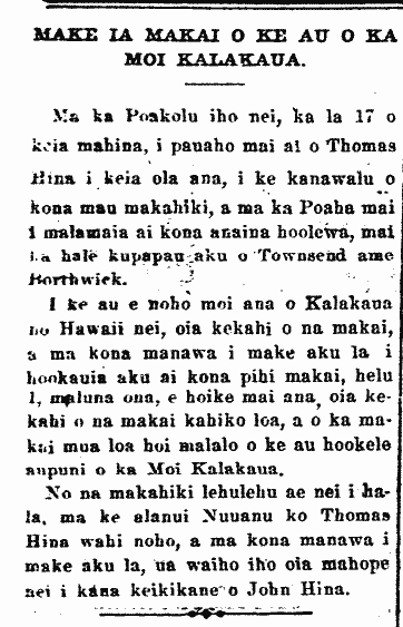 On that day mentioned, Kahanamoku went swimming at the ocean that afternoon for his health, and upon his return, he lay to rest before dinner, saying that he was feeling dizzy; and a few minutes thereafter, his life breath left him and he went to where all must go. It is said that the cause of his death was heart disease.