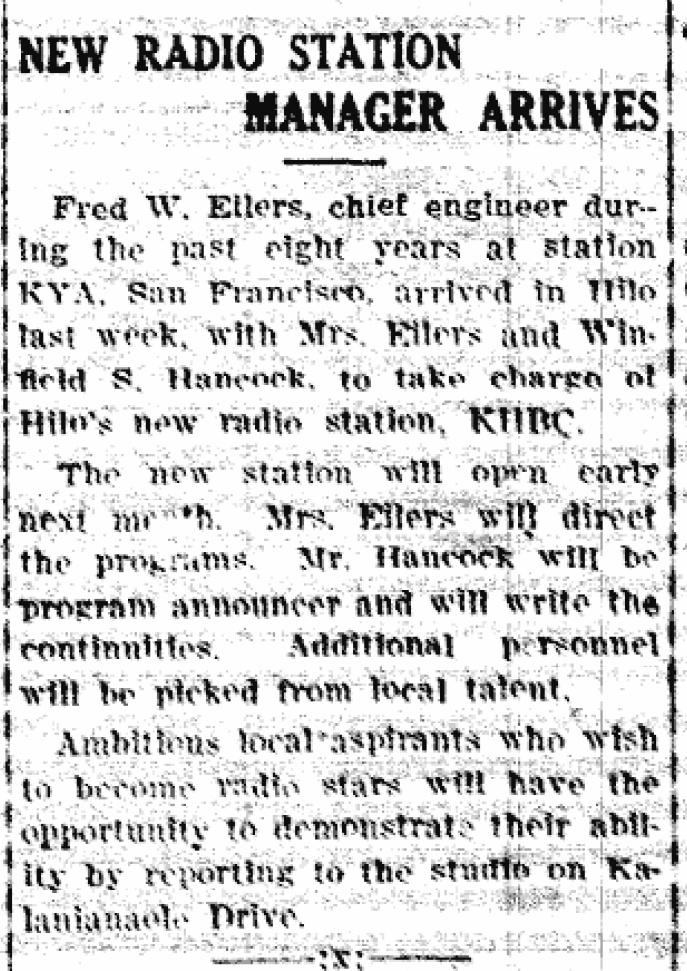 This Station will open on the first of May, therefore, we want these talented people to come to K. H. B. C. from now forth to prepare for the approaching first day of May.