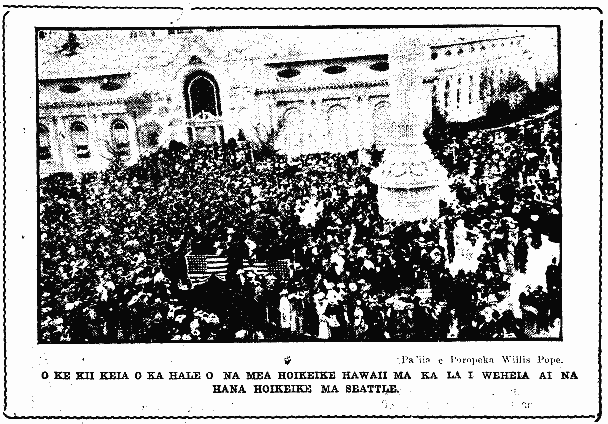 The program for the day is most complete. At 6:30 in the morning, the members of the hui will meet at the Waikiki residence of Mrs. Puahi, at which time all will don the pa-u. At eight o’clock the line will begin to form, Sheriff A. M. Brown being the marshal of the parade. At 8:30 the procession will move to the Kapahulu road, thence to Beretania street, thence to Washington place. Continue reading
