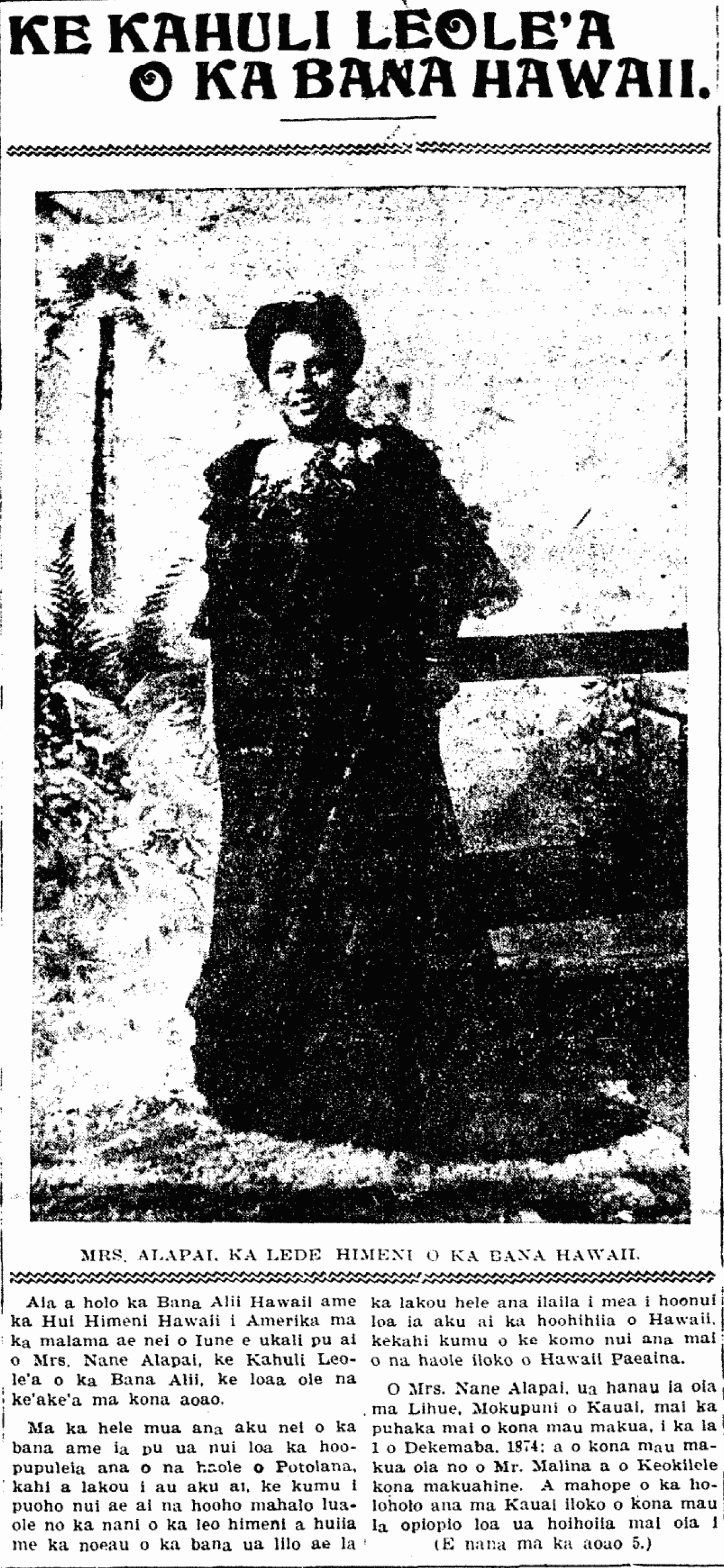 Mrs. Nane Alapai [Nani Alapai], was born in Lihue, on the island of Kauai, from the loins of her parents, on the 1st of December, 1874; her parents are Mr. Malina and Keokilele is her mother. And after going around Kauai during her youth, she was taken…