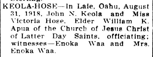 KEOLA-HOSE—In Laie, Oahu, August 31, 1918, John N. Keola and Miss Victoria Hose. Elder William K. Apua of the Church of Jesus Christ of Latter Day Saints, officiating; witnesses—Enoka Waa and Mrs. Enoka Waa.