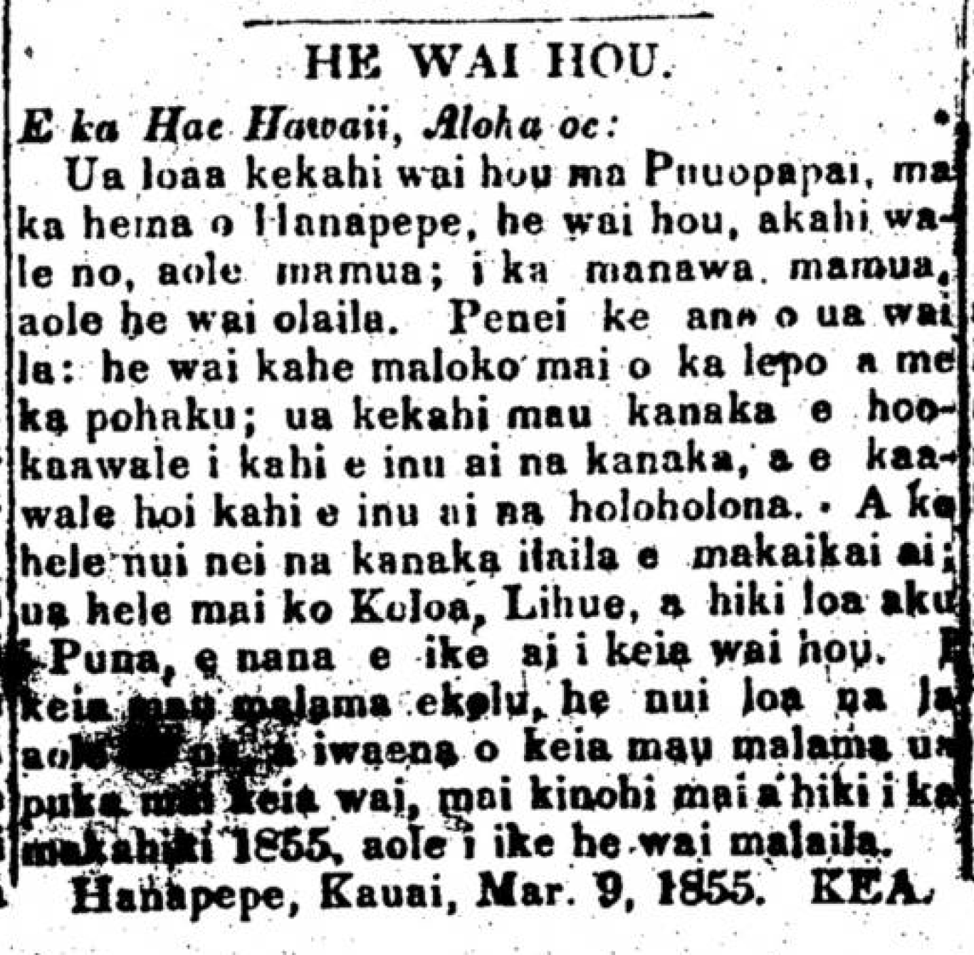 A new water source was found at Puuopapai, to the south of Hanapepe. It is a new water source found only now, not before. In earlier days there was no water there. This is the nature of that water: It is water that flows within earth and stone; some people have divided it into a place where people drink, and where animals drink. There are many who are going there to sightsee, from Koloa, Lihue, and all the way to Puna, to go and see this new water source. These past three months, there were a lot of sunny days without rain, and it was during these months that the water appeared. From the beginning to the year 1855, water was not seen there.