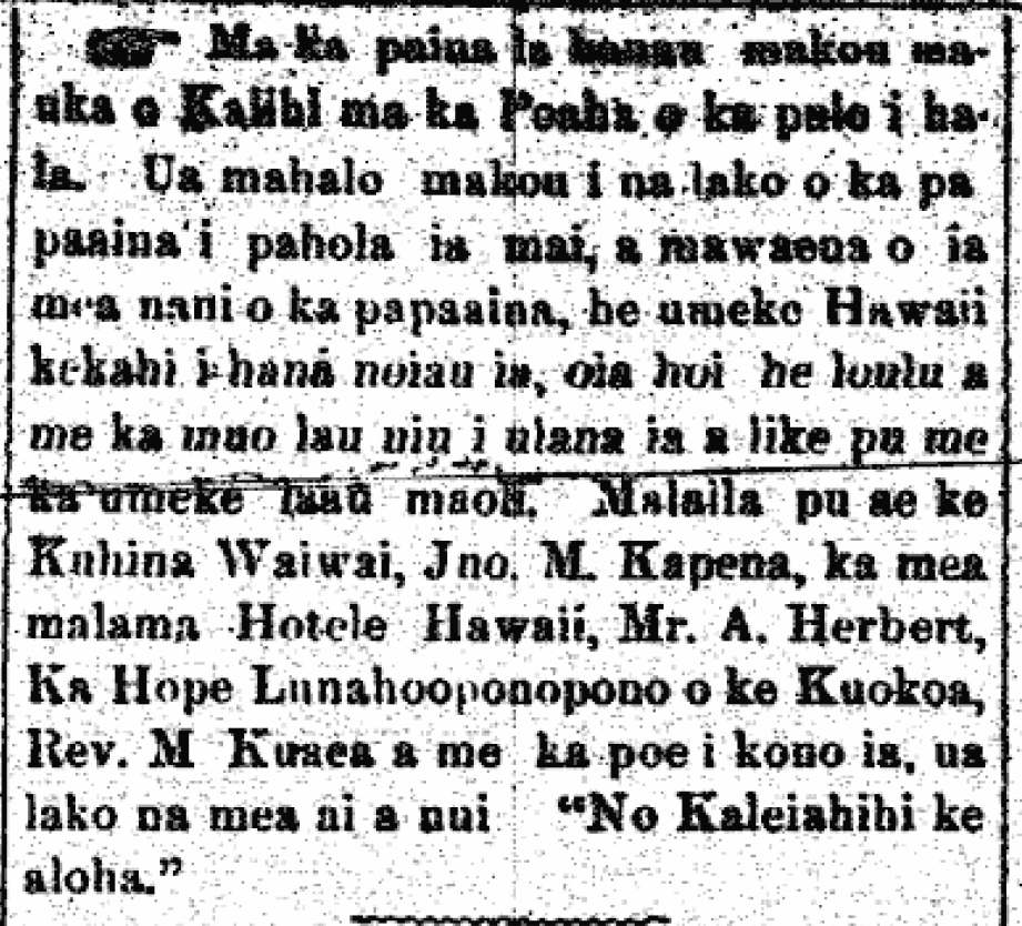 We were at a birthday party in the uplands of Kalihi on last week Thursday. We admired how well supplied the table was spread, and from among the beautiful things on the table, there was a skillfully crafted Hawaiian umeke, that is, it was loulu palm and the young coconut fronds woven just like a wooden calabash. Also there was the Minister of Finance, John M. Kapena; the Hawaiian Hotel keeper, Mr. A. Herbert; the subeditor of the Kuokoa, Rev. M. Kuaea; as well as those who were invited; there was much food supplied. “Aloha to Kaleiahihi.”