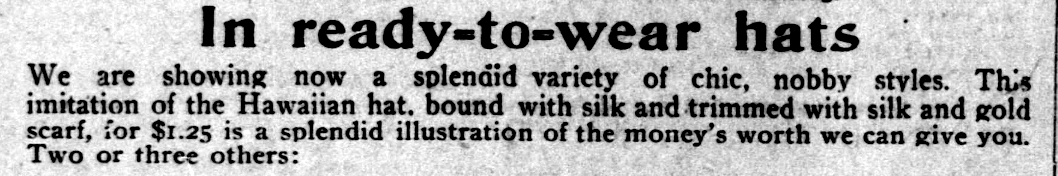 We are showing now a splendid variety of chic, nobby styles. This imitation of the Hawaiian hat, bound with silk and trimmed with silk and gold scarf, for $1.25 is a splendid illustration of the money’s worth we can give you Two or three others:…