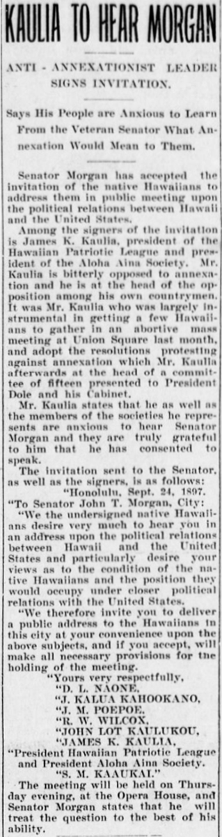 We, the people of the Hawaiian Islands, through the delegates of the branches of the Hawaiian Patriotic League [Hui Hawaii Aloha Aina] of all the districts throughout the kingdom, in convention assembled, take this mode of submitting our appeal and expression of our unanimous wishes to the people of our great and good friend, the Republic of the United States of America, with whom we always entertained the most cordial relations, whom we have learned to look upon as our patrons and most reliable protectors, and whose honor, integrity, and sense of justice and equity we have ever confidently relied for investigation into the grievous wrongs that have been committed against us as a people, against the person of our sovereign, and the independence of our land.