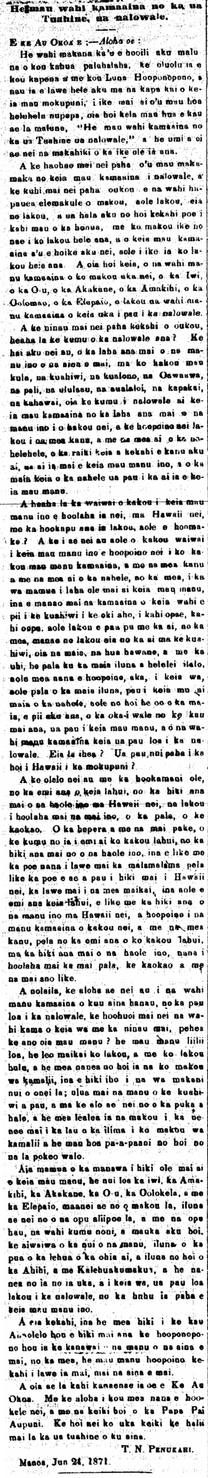 And I say without any hypocrisy, the decrease of this people was because the arrival of the evil haole to Hawaii nei; it was they who spread the evil sicknesses: gonorrhea [pala] and syphilis [kaokao]. Smallpox [hepera] and leprosy [mai pake] are the reasons that our lahui was decimated, because of the arrival of the evil haole; if all the people who came to Hawaii were like the people who brought the light [missionaries], then this lahui would not have decreased in number; so too with the arrival of the evil birds to Hawaii nei, which hurt our native birds and plants; this is like the decrease of our lahui with the arrival of the evil haole who spread gonorrhea and syphilis and similar diseases.