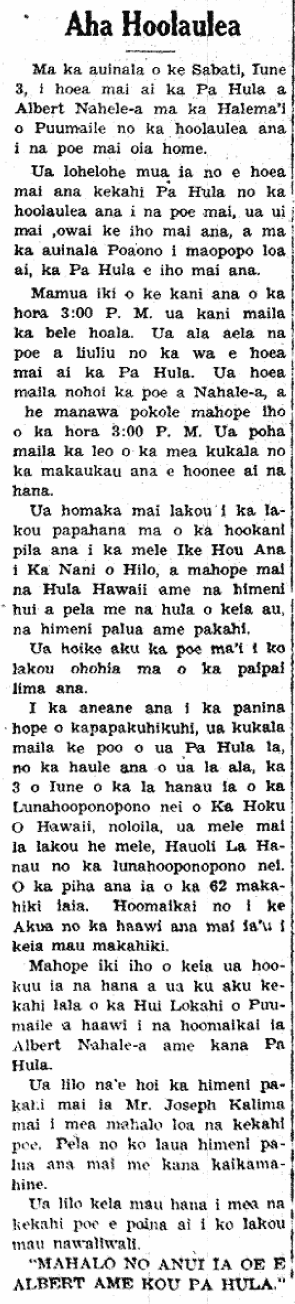 In the afternoon of Sunday, June 3, the Hula Studio of Albert Nahale-a [Pa Hula a Albert Nahale-a] arrived at the Puumaile Hospital to entertain the patients at that home.