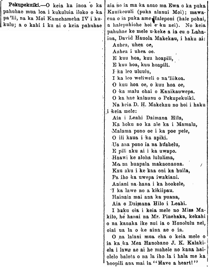 He composed this song for Miss Makilo, a hanai child of Mr. Pinehaka [? William Pinehasa Wood], one of the well-known men of Honolulu nei, in those days he lived there [? oiai ua la o ke aina ae o ia].