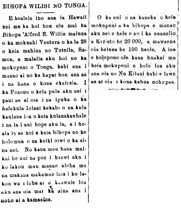 Bishop Alfred E. Willis is leaving Hawaii, and not returning, aboard the steamship Ventura on the 28th of this month for Tutuila, Samoa, and from there for the island of Tonga, where he intends to take up the work of his church. Last Saturday he closed the doors of Iolani School, one of the very well known schools of this town in days gone by,  and it was established by this bishop for the advancement of the native children of this land. For his good works, there were many people gave their expressions of aloha and precious gifts to him when they heard that he will forever leave this land that he became a local to.