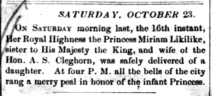 ON SATURDAY morning last, the 16th instant, Her Royal Highness the Princess Miriam Likelike, sister to His Majesty the King, and wife of the Hon. A. S. Cleghorn, was safely delivered of a daughter. At four P. M. all the bells of the city rang a merry peal in honor of the infant Princess.