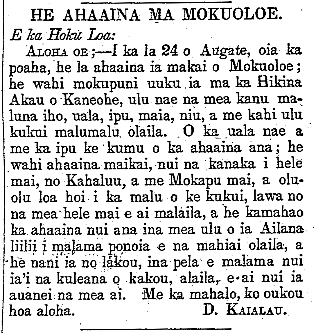 Aloha oe:—The 24th of August, which was a Thursday, was a day of party at the shore of Mokuoloe; it is a small island to the Northeast of Kaneohe, and yet plants grow upon it: sweet potato, gourd, banana, coconut, and its shady kukui grove. The focus of the feast was the sweet potato and gourd; it was a fine party, with many people who came from Kahaluu, and Mokapu, and it was very pleasant in the shade of the kukui, with enough food for all that came; the great spread of produce well-cared for by the farmers of this tiny Island was astonishing, and it would be a good thing if all our own lands were taken care of in the same way, then we’d in time be feasting off of the fruits. With mahalo, your friend.