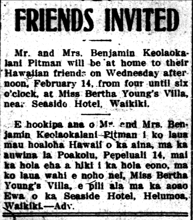 He is a direct cousin to George Mooheau Beckley, as their mothers were sisters; Kinoole is Mr. Pitman’s mother, and Kahinu is George C. Beckley’s. The two of them were daughters of the Alii Hoolulu who hid the bones of Kamehameha Ka Na’i Aupuni. He [Pittman] went with his people on a tour to see the fire of the enchanting woman of the pit, and on their return, they were entertained at the home of Mrs. Maraea Wilipaona [? Mrs. Maria Wilfong], and Mrs. J. D. Lewis and Mrs. Wilfong put on a luau to honor this Hawaiian Alii. On this trip of his to his homeland, accompanying him were his wife and some friends from Boston. On Saturday evening, he and his wife left for Honolulu, and from their they will return to his home in Boston. He is now a Millionaire living in Boston.