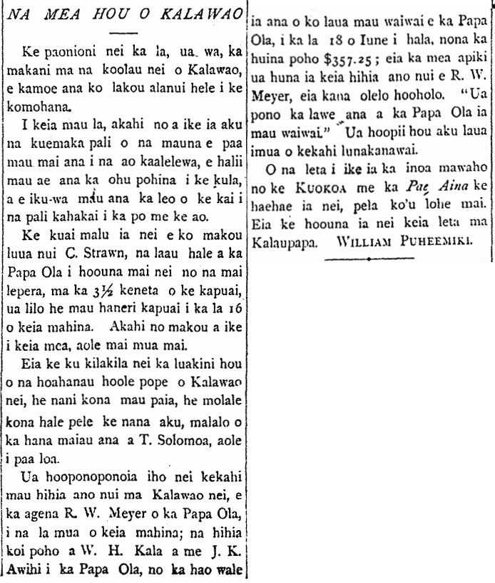 Some major problems here in Kalawao were remedied by the agent of the Board of Health, R. W. Meyer, earlier this month; the claim for damages by W. H. Kala and J. K. Awihi against the Board of Health, for the seizing of their property by the Board of Health on the 18th of this past June, totaling $357.25; here is the deceitful thing: this important claim was hidden away by R. W. Meyer, and this was his decision. “The Board of Health was justified in the seizing of this property.” They two of them filed suit once again before a judge.”
