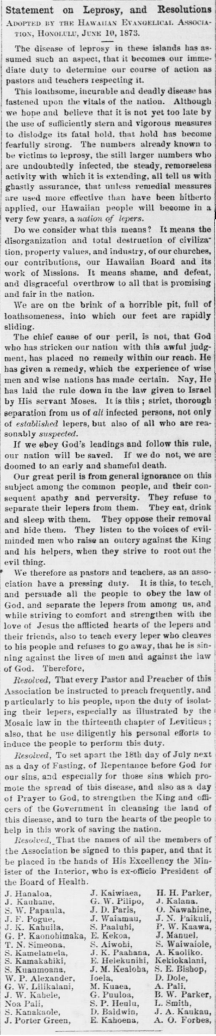 The disease of leprosy in these islands has assumed such an aspect, that it becomes our immediate duty to determine our course of action as pastors and teachers respecting it.