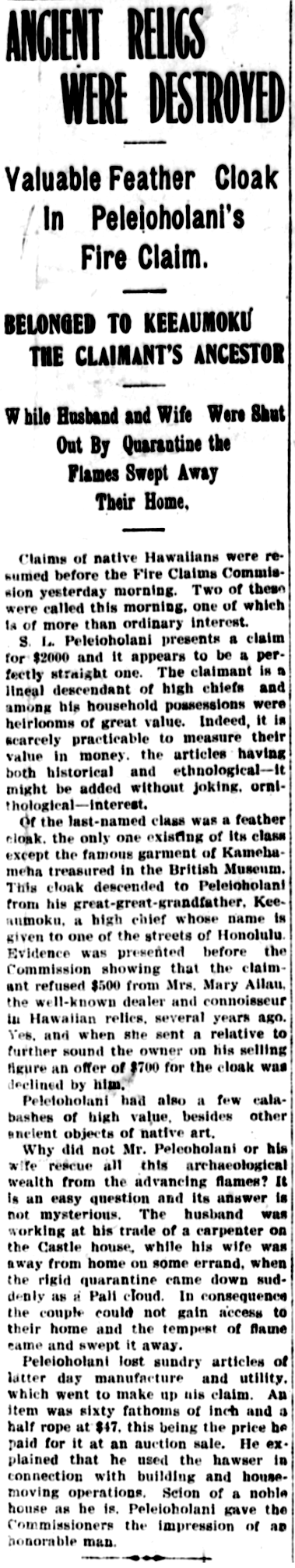 Of the last-named class was a feather cloak, the only one existing of its class except the famous garment of Kamehameha treasured in the British Museum. This cloak descended to Peleioholani from his great-great-grandfather, Keeaumoku, a high chief whose name is given to one of the streets of Honolulu. Evidence was presented before the Commission showing that the claimant refused $500 from Mrs. Marry Ailau, the well-known dealer and connoisseur in Hawaiian relics, several years ago. Yes, and when she sent a relative to further sound the owner on his selling figure an offer of $700 for the cloak was declined by him.