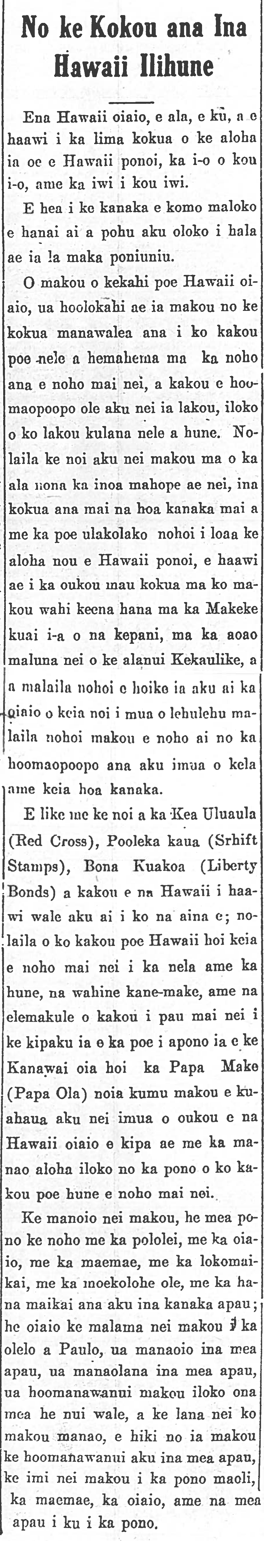 Just as with the pleas of the Red Cross (Kea Ulaula), Thrift Stamps (Pooleka Kaua), Liberty Bonds (Bona Kuokoa), to which we Hawaiians gave freely to those of foreign lands; this is our own Hawaiian people who are living in poverty, widows, and elderly who were kicked out by those who are responsible under the Law for their care, that being the Board of Health, and for that reason, we announce before you all, O True Hawaiians, come see us with aloha for the good of our own people living in poverty.
