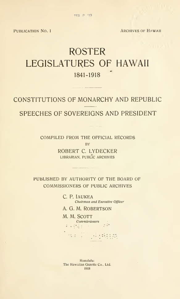 [This is a great reference on various information about the Legislature of Hawaii from 1841 all the way to 1918! It can be found word-searchable online here!!]
