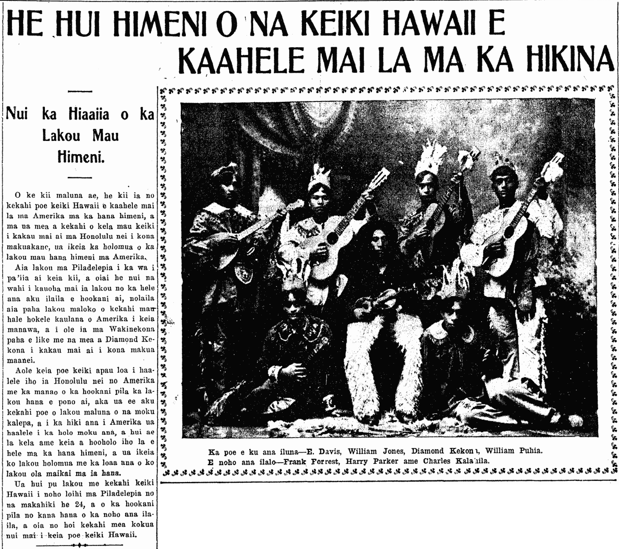 Aloha oe:–Perhaps you are surprised receiving this letter. I have tried all means to release your beloved son Diamond from the British armed forces. I appeared before the American Consul in the countryside here in England, telling them that Diamond is an American. They responded that they will put my request before the head consul in London. On the 17th of September, I went to the Consulate in London, they told me that the consul could not order the British government to release Diamond because he is 25 years old; only those below 20 years old, if they are American citizens. These past days, I decided to have your daughter-in-law (Amy Kekona) to come to see me, and get together with her to think of a way to release her husband; for these good reasons, I ask that you send me his birth certificate, or to go to the governor of Hawaii to write to the Hawaiian Delegate Mr. J. K. Kalanianaole in Washington D. C., to go to the State Department in Washington and have the American Ambassador in London investigate the circumstances of his enlisting in the armed forces, and you verify that your first-born son is a true Hawaiian. He had a document in the city of Paris, France, from the office of the American General, written on the 13th of February, 1914, attesting to the fact that he is a Hawaiian. If he finds these documents, he will be victorious. Do not neglect this, for I am still regretful not having his acting. He has much knowledge in this area, and his showing this to the world would bring fame to the Hawaiian Lahui. I will organize everything here and send it to London. With our sleuthing, I believe everything will progress; may God watch over and keep safe the life of your child until we meet again, amen.