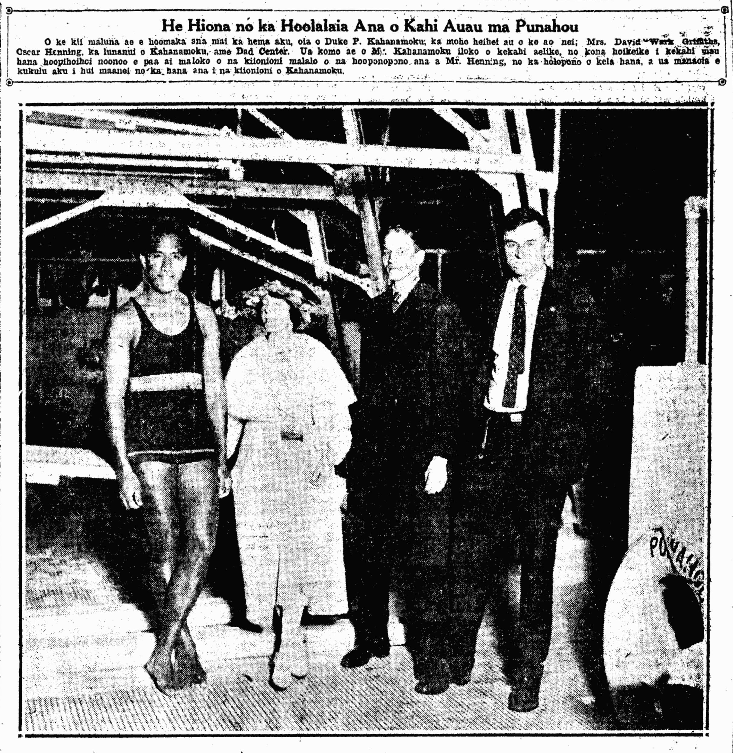 PROMINENT among the leading lights at the dedication of the Punahou tank were the group pictured above. They are, from left to right, Duke P. Kahanamoku, Mrs. David Wark Griffiths, Oscar Henning, Duke’s manager; and Dad Center Continue reading