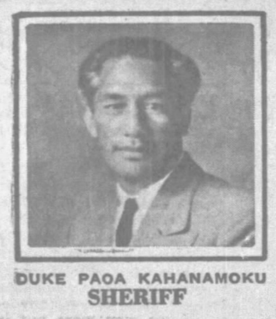 Kahanamoku, scion of one of the few remaining full-blooded Hawaiian families in the islands, was responsible for returning the sheriff’s office, for the first 25 years of city and county government always held by a Democrat, to the Democratic fold after it had lapsed momentarily into the hands of the Republicans with results that are too well known and too well remembered by every resident of Hawaii to repeat here.