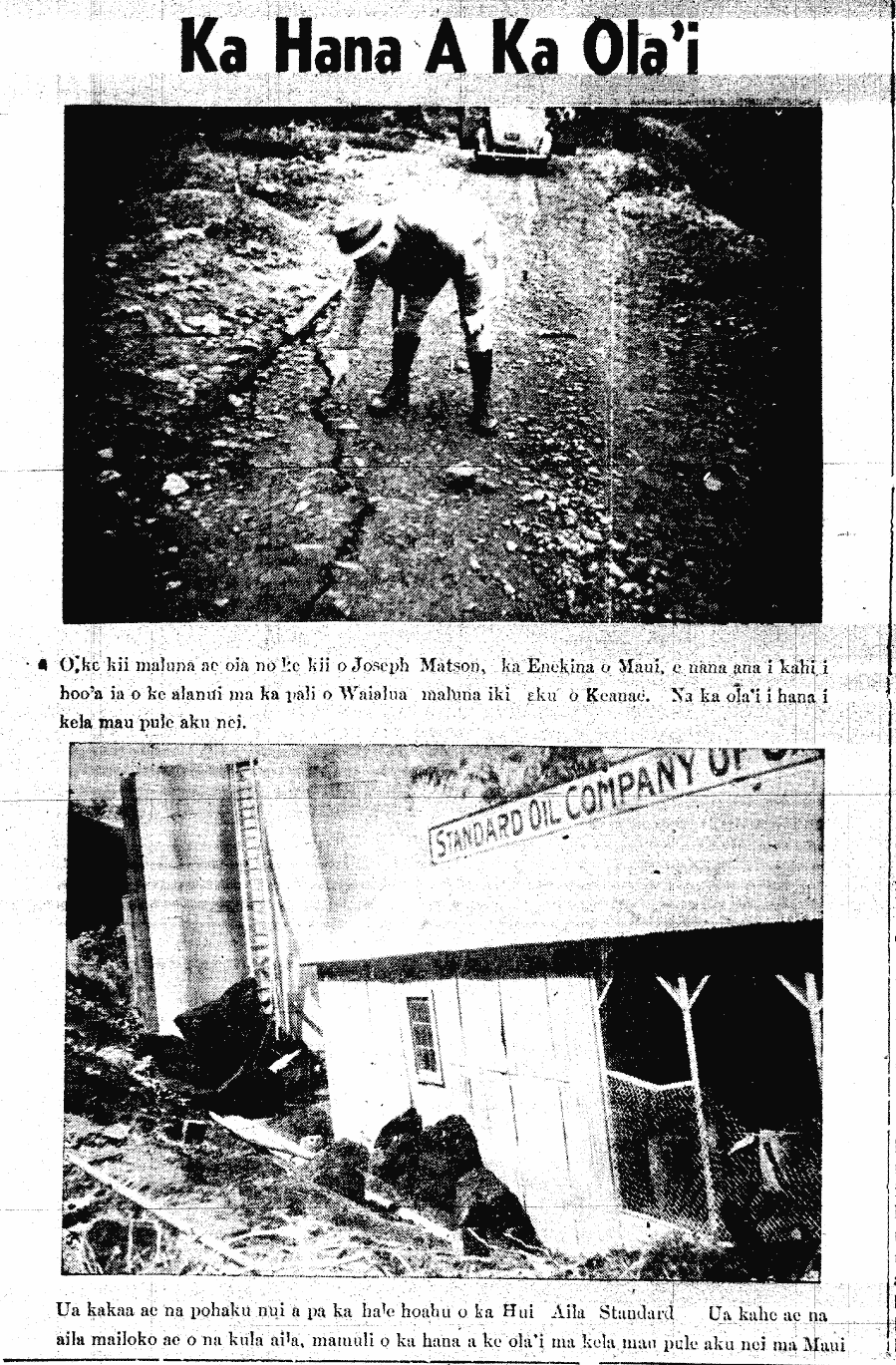 For those whose lives were in danger, when the water entered their houses, a man named Kapai got up with his two children and ran out, but they were taken by the sea and died, so too with some women and their children, they were beaten by the sea; some people with their daughter escaped by running and climbing a hala tree. Auwe! Auwe! in dire straits. Make haste O Ke Au Okoa, speed on the wings of the wind to report of this frightening news here in Puna and perhaps elsewhere as well. B. H. M. Kailiwahine.