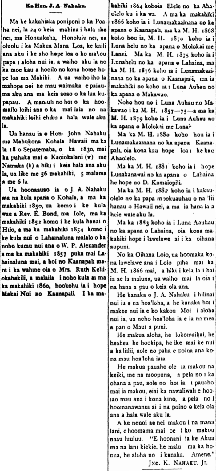 J. A. Nahaku was educated at the district school of Kohala, and in the year 1850, he entered into the school of Rev. E. Bond, at Iole, and in 1852, he entered into the Hilo Boarding School, and in 1854, he entered into Lahainaluna College under the tutelage of W. P. Alexander, and in 1857, he graduated from Lahainaluna and returned to Kaanapali where he married his wife, Mrs. Ruth Keliiokahekili, and there he resided and in 1860 he was appointed Sheriff of Kaanapali. In 1864, he was elected as a Delegate to the Constitutional Convention. And in 1866, he was elected as the Representative for the district of Kaanapali, and in 1868, he was reelected, and in 1870 he was appointed as census taker [Luna helu] for the district of Molokai and Lanai. In 1875, he was appointed as Census taker for the district of Lahaina, and in 1876 he was elected as Representative for the district of Kaanapali, and in the same year he was chosen as Tax Assessor for the district of Makawao.