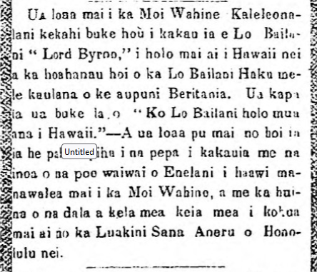 With the words “Ema Kaleleonalani” and “the Dowager Queen,” amongst the articles last week under the title “Kamehameha School [Kula Kamehameha];” what was correct for that part was Mrs. B. Pauahi Bishop. The words above were inserted by mistake because of the influence of reminiscences for Emma, and also because these high chiefs of the land sank down together, dying one after the other. Continue reading