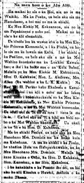 The injured foot of Her Royal Highness Princess Kamamalu is feeling much better, and on Thursday, she went fishing at Kalia. On Friday evening, she went with the Queen dowager to Kawaiahao Church to see the Sunday School examinations. Also there were His Highness M. Kekuanaoa, the Hon. D. Kalakaua, Hon. L. Andrews, Mrs. Allen (the wife of the Chief Justice [Elisha Hunt Allen]). Rev. H. H. Parker, the kahu of Kawaiahao Church lead the alii to sit at the seats made ready for His Highness M. Kekuanaoa, Her Royal Highness Princess Kamamalu, and the dowager Queen. The alii were escorted by the Hon. D. Kalakaua.