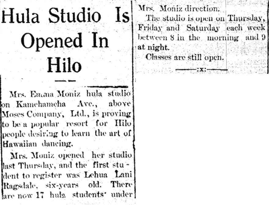 Besides the tableau, based on a native legend, Mrs. Moniz will stage a program of ancient and modern hula dances featuring several of her most talented pupils. There will be some 40 performers, all of them from Kohala, including a number of Filipino, Japanese and Portuguese dancing girls, besides Hawaiian.
