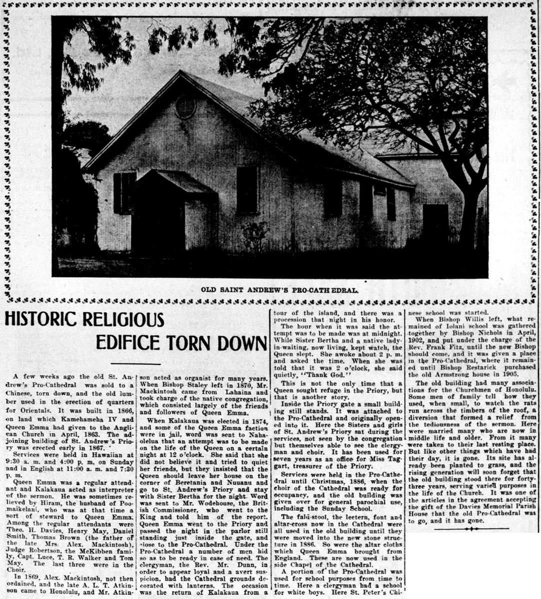 A few weeks ago the old St. Andrew’s Pro-Cathedral was sold to a Chinese, torn down, and the old lumber used in the erection of quarters for Orientals. It was built in 1866, on land which Kamehameha IV and Queen Emma had given to the Anglican Church in April 1863. The adjoining building of St. Andrew’s Priory was erected in 1867.
