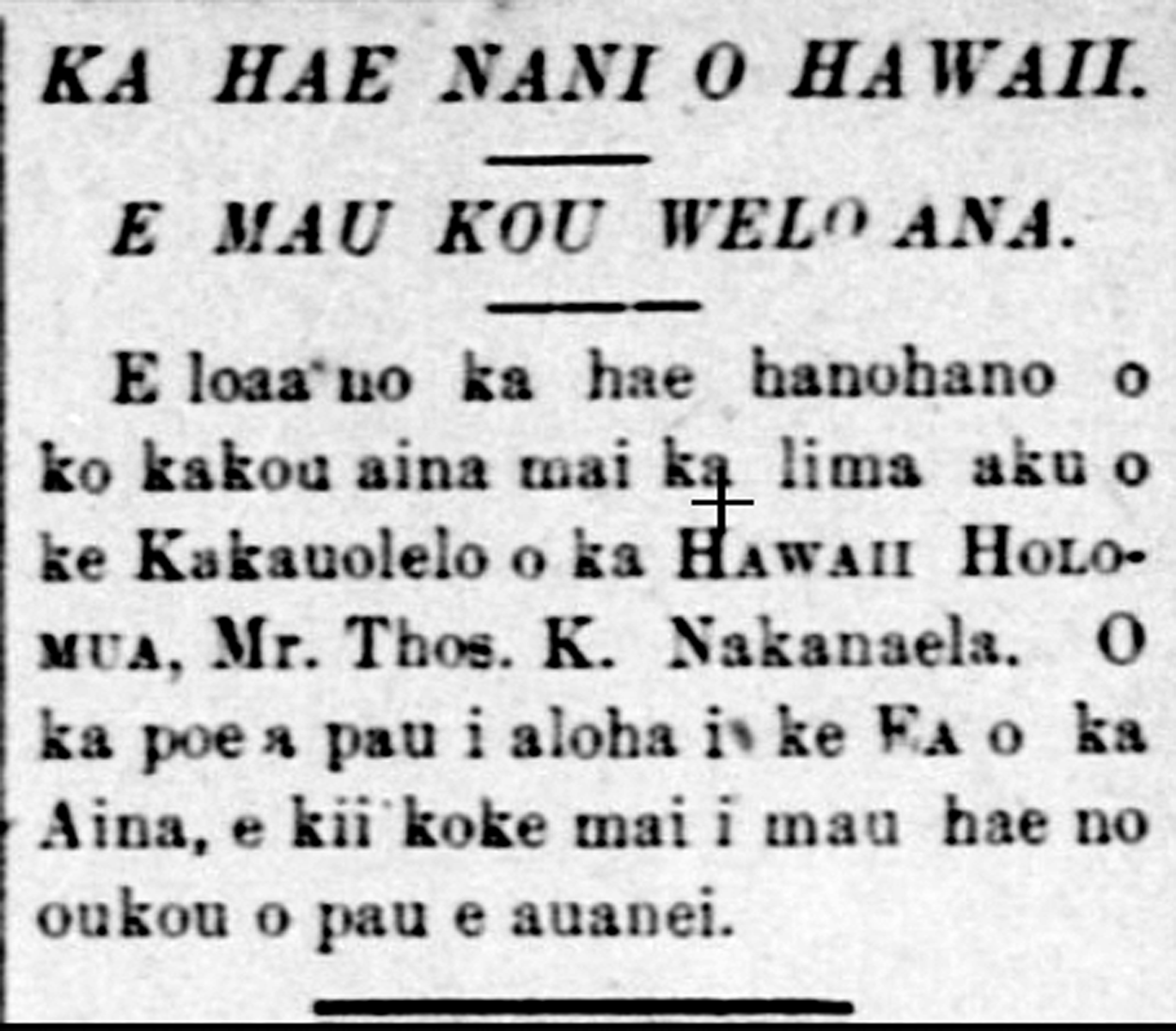 You may obtain the glorious flag of our land from the hands of the Secretary of the Hawaii Holomua, Mr. Thomas. K. Nakanaela. All those who have aloha for the Independence of the Land, come and get flags for yourself lest they run out.