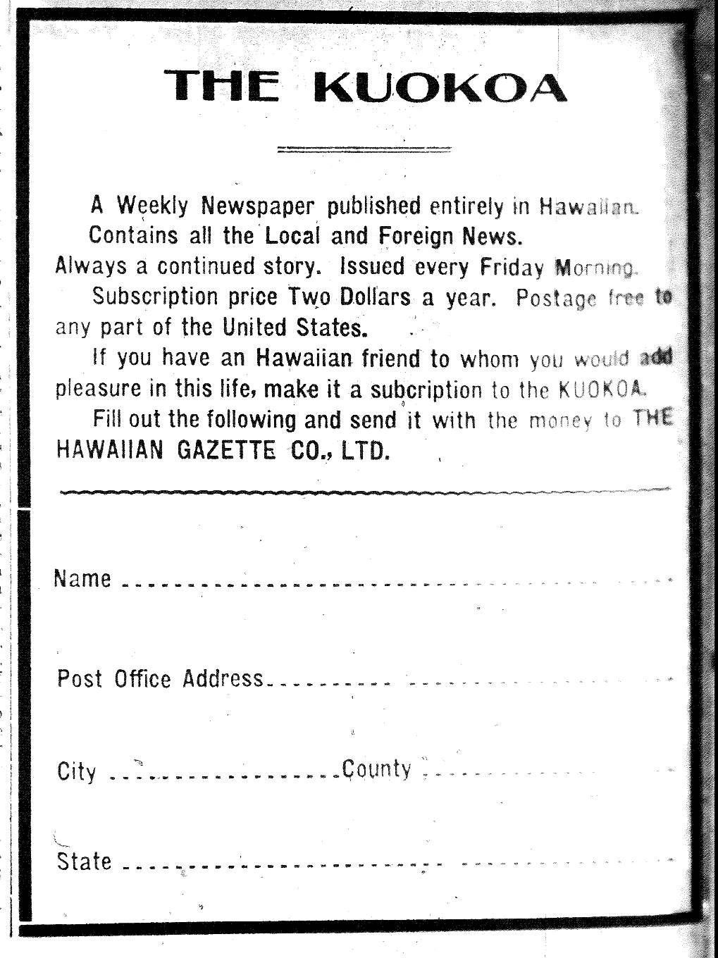Because of the desire to liquidate the story book of Kaluaikoolau which are stacked up in the publishing office, one of those books will be given away for free to each person who buys the Kuokoa directly from the office of the Hawaiian Gazette Company, beginning this morning.