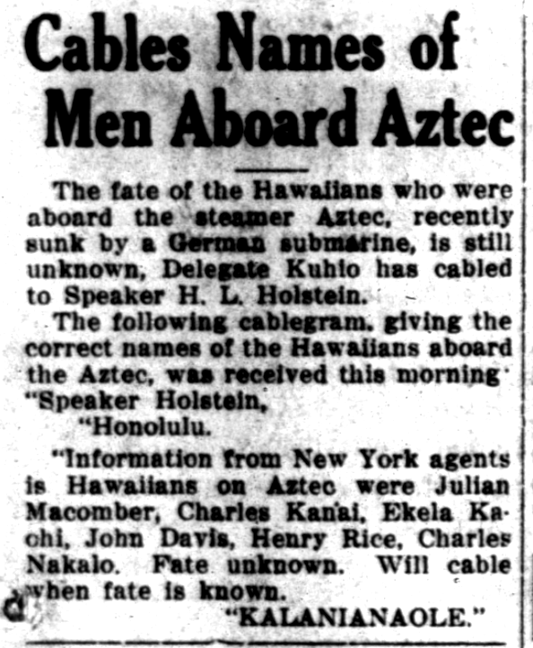 The fate of the Hawaiians who were aboard the steamer Aztec, recently sunk by a German submarine, is still unknown, Delegate Kuhio has cabled to Speaker H. L. Holstein.