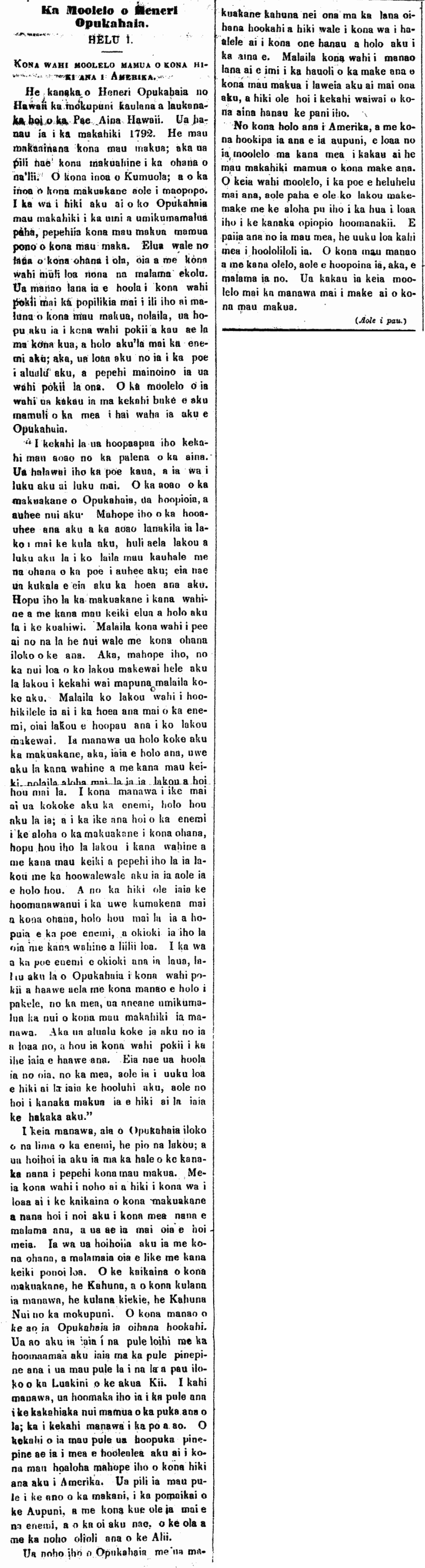 [A couple of years later in 1867, the original translation was appended to and corrected with the information collected by that same S. W. Papaula of Napoopoo, and published in book form under the title: “KA MOOLELO O HENERI OPUKAHAIA, UA HANAUIA MA HAWAII, M. H. 1787, A UA MAKE MA AMERIKA, FEBERUARI 17, 1818. OIA KA HUA MUA O HAWAII NEI.”]