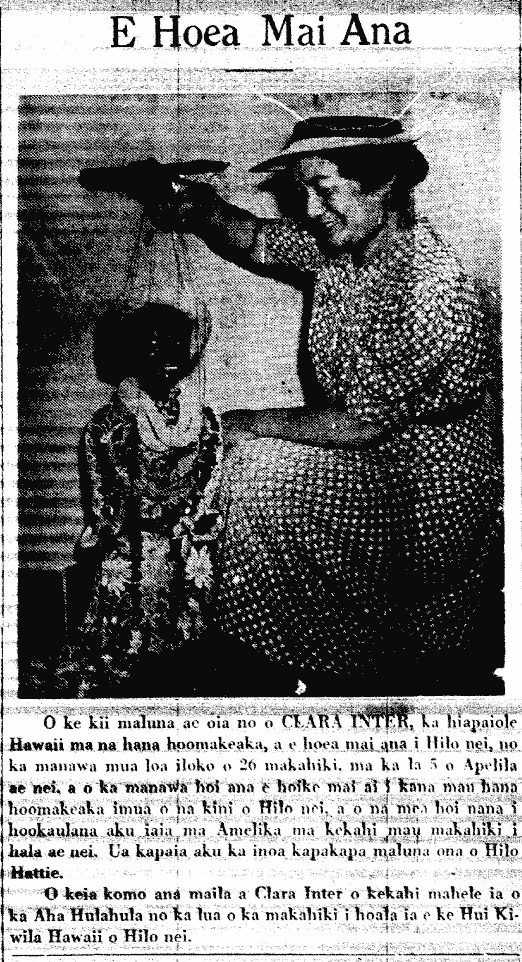 The picture above is of CLARA INTER, the Hawaiian champion of comedy, and she is coming to Hilo nei, for the first time in 26 years, on the 5th of this coming April; and this is when she will be showing her humor before the people of Hilo, and what she was made famous for in America some years ago. She is nicknamed Hilo Hattie.