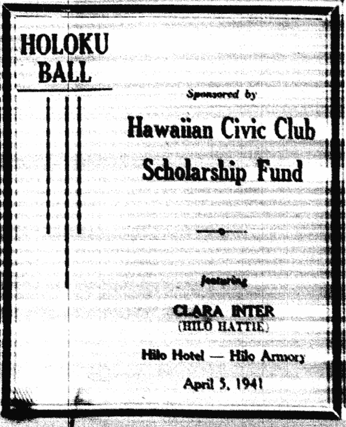 Clara Inter is part of a Dance [Holoku Ball] put on for the second year by the Hawaiian Civic Club of Hilo [Hui Kiwila Hawaii o Hilo].