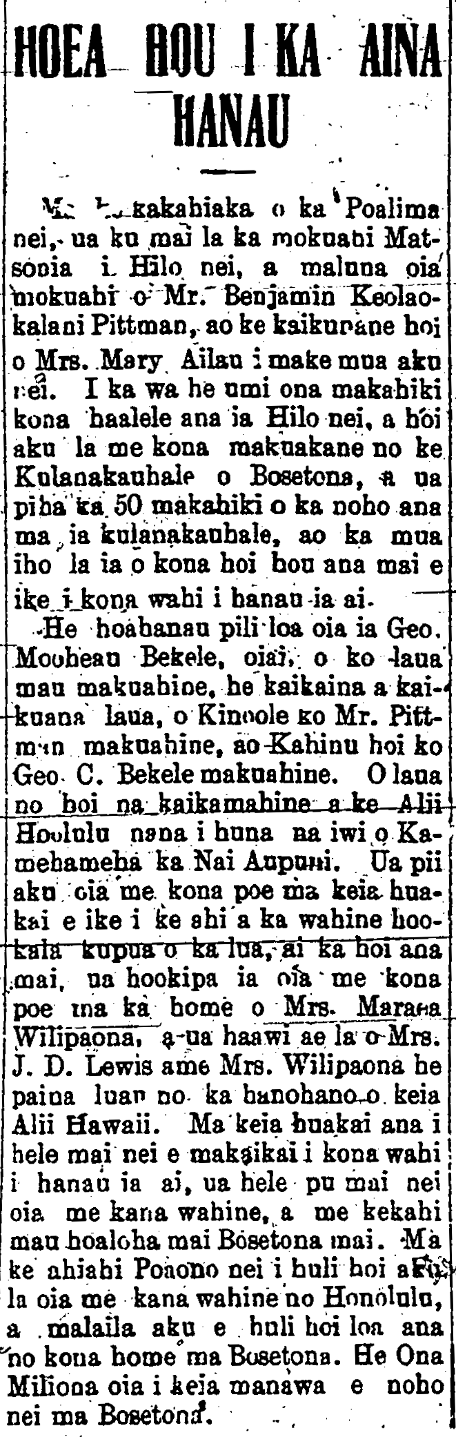 In the morning of last Friday, the steamship Matsonia docked in Hilo nei, and aboard the ship was Mr. Benjamin Keolaokalani Pitman [Pittman], the brother of the recently deceased Mrs. Mary Ailau. He left left Hilo when he was 10 years old, and went back with his father to the city of Boston, and he has lived there for a full 50 years, and this is the first time he has returned to see the place where he was born.