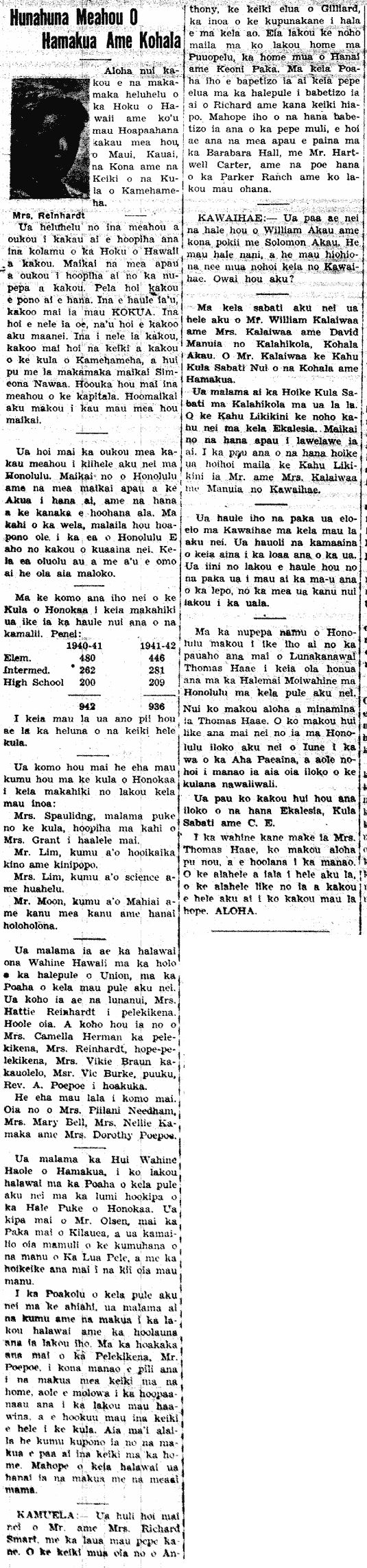 [Mrs. Reinhardt was the news correspondent for Hamakua and Kohala to the newspaper Hoku o Hawaii.]