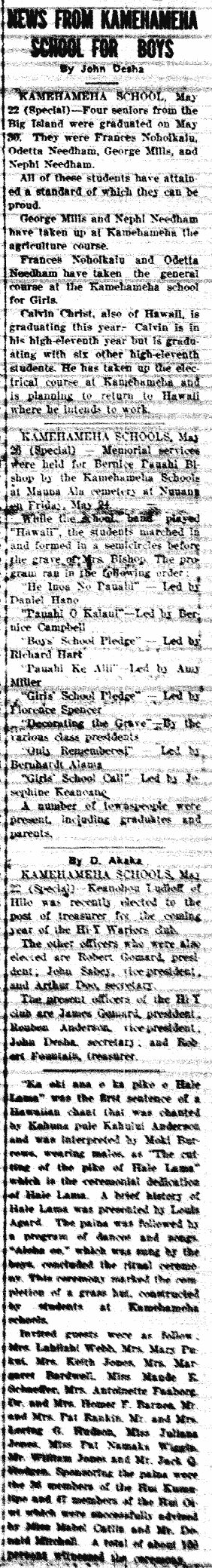 KAMEHAMEHA SCHOOL. May 22 (Special)—Four seniors from the Big Island were graduated on May 30. They were Frances Nohoikaiu, Odetta Needham, George Mills, and Nephi Needham.