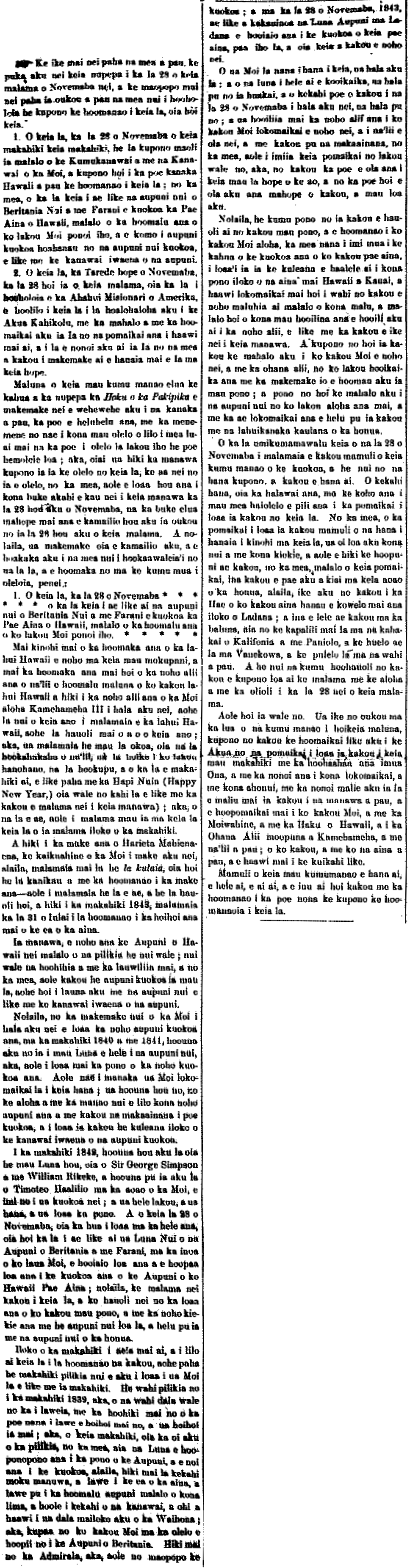 Upon these two ideas are the basis of what the newspaper Hoku o ka Pakipika wants to expound upon for all readers, while we feel hesitant about our words lest they be spit back out by those who call themselves perfect; but being that the time has come for the newspaper to speak about this day, it steps forward to speak, for there will be no other opportunity in its first volume where the date of November 28th will appear; and in the following second volume, it will once again speak to you about the 28th of this month. Therefore, it desires to speak and make clear the important reasons this day is set aside, and it will begin with the first stated reason, thus: