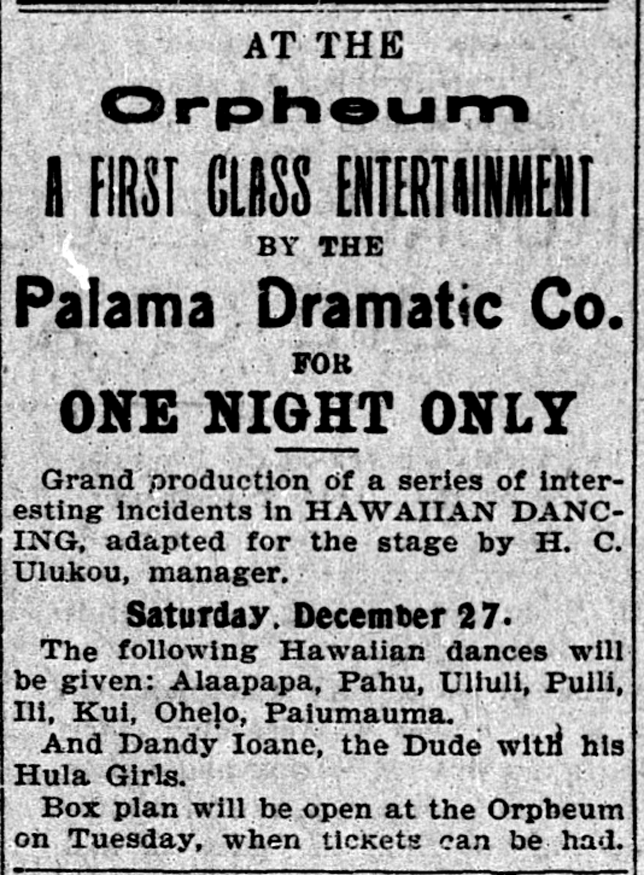 Grand production of a series of interesting incidents in HAWAIIAN DANCING, adapted for the stage by H. C. Ulukou, manager.