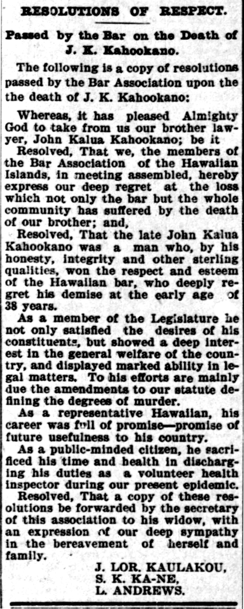 Resolved, That the late John Kalua Kahookano was a man who, by his honesty, integrity and other sterling qualities, won the respect and the esteem of the Hawaiian bar, who deeply regret his demise at the early age of 38 years.