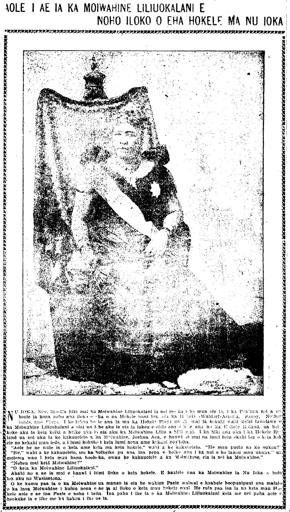 New York. Nov. 30.—Queen Liliuokalani arrived here last Friday unannounced, and she was refused stay at four posh hotels: The Waldorf-Astoria, Savoy, Netherlands, and Plaza. After being refused by the Plaza, one of the Queen’s servants saw this and and being that he heard them saying they were headed to the Hotel Roland, he went at once and announced that the Queen would be arriving. When Joshua Aea, her secretary, asked for their best room for some ladies, and for a room nearby for him and his friends.