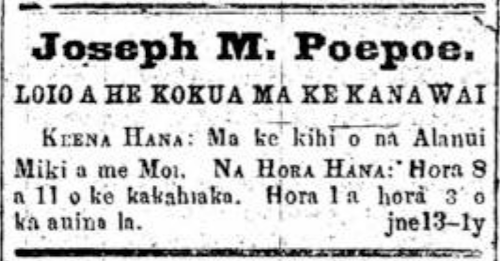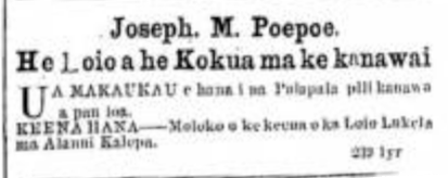 Joseph Mokuohai Poepoe, advertisement, 1886.