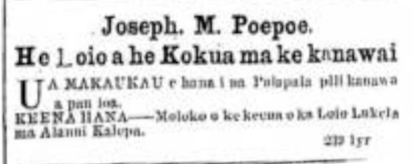 Joseph Mokuohai Poepoe, advertisement, 1886.