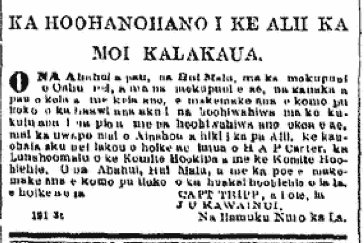 All of the Associations, the Secret Societies, on this island of Oahu, and the other islands, people of all ethnicities, who want to join in giving glory by putting up arches and other public displays from the wharf of Ainahou until the Palace grounds, are ordered to appear before H. A. P. Carter, the Chairman of the Welcoming Committee and the Exaltation Committee. The Associations, the Secret Societies, and those who want to join in the parade of the day, notify CAPT. TRIPP or