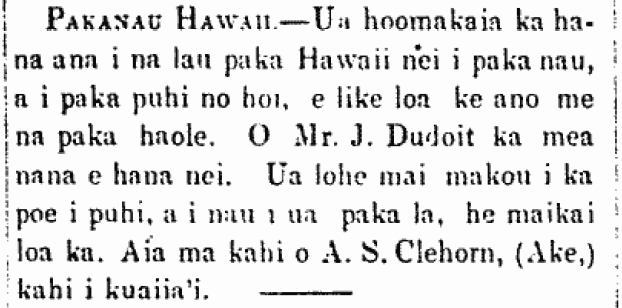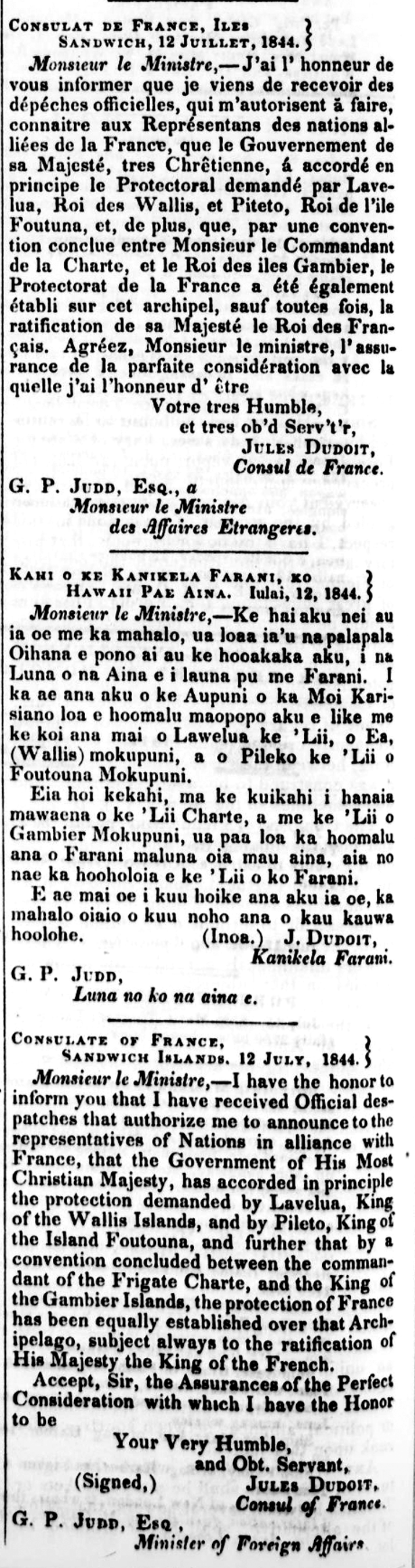 Monsieur le Ministre,—Ke hai aku nei au ia oe me ka mahalo, ua loaa ia’u na palapala Oihana e pono ai au ke hooakaka aku, i na Luna o na Aina e i launa pu me Farani. I ka ae ana aku o ke Aupuni o ka Moi Karisiano loa e hoomalu maopopo aku e like me ke koi ana mai o Lawelua ke ‘Lii, o Ea, (Wallis) mokupuni, a o Pileko ke ‘Lii o Foutouna Mokupuni.