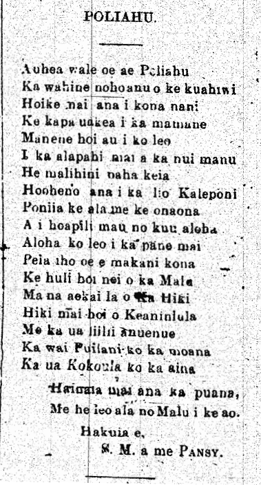 Perhaps that is so, perhaps he was a liar, and perhaps not; it might be thought that Kapihe’s was a riddle and the land would not literally join together, and that he was a prophet. Perhaps his words were not his alone, but from God. Someone might ask, how did Kapihe’s words come from God, and here is the answer. What of Isaiah, that prophet, in Matthew 3:3? For this is what was spoken by the prophet Isaiah, ‘The voice of the one crying in the wilderness: ‘Prepare ye the way of Jehovah, make his paths straight.'” Here is the question there. Is it a real road, and is it a path that will be tread on by feet? It is believed not, but that it was a riddle from God through the mouth of his prophet. Maybe so too it was of Kapihe, the prophet of Hawaii; God gave the words for his mouth to speak, and Kapihe spoke what God of the heavens gave to us. And the nations of man joined as one, from America, and the other inhabited lands, they are here together with us. And the souls of the righteous are the same up above. The alii of whom Kapihe predicted was Kamehameha I, who was victorious over Maui and Oahu, and Kauai was left, and his grandchildren now rule over his Kingdom. This is the nature of Kapihe’s words. J. D. Kauakoiawe